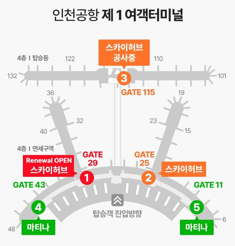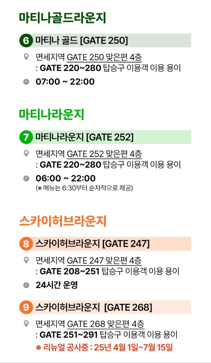 - 예: 인천공항 1터미널 4층 면세구역 42번 게이트(서편), 11번 게이트(동편)에 스카이허브 라운지 위치.