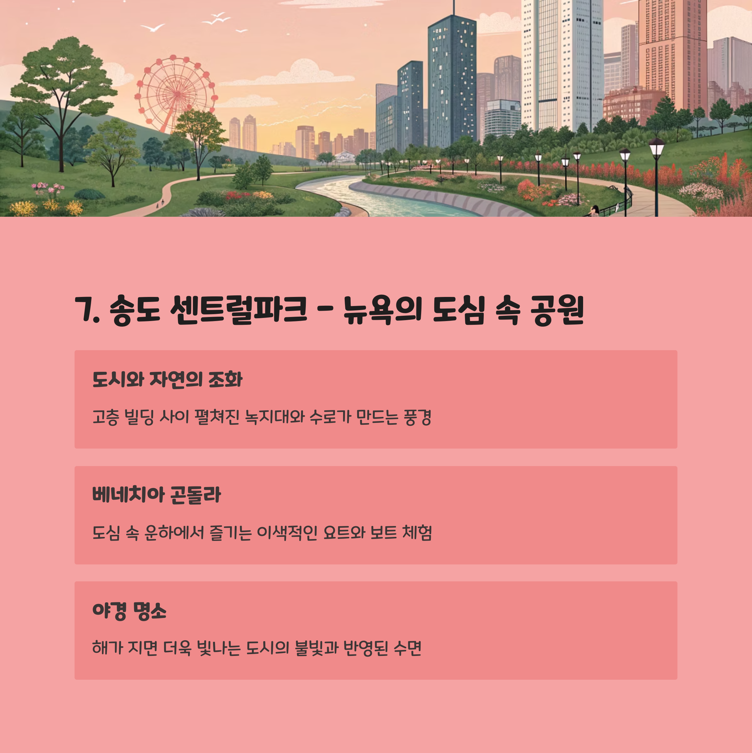 인천 송도의 센트럴파크는 말 그대로 한국 속 뉴욕이에요. 고층 유리 빌딩과 그 사이로 흐르는 인공 수로, 그리고 수상택시까지… 이 모든 게 완벽한 도시형 감성 여행을 만들어주죠. 특히 야경이 진짜 예술이니 꼭 해 질 무렵도 놓치지 마세요!