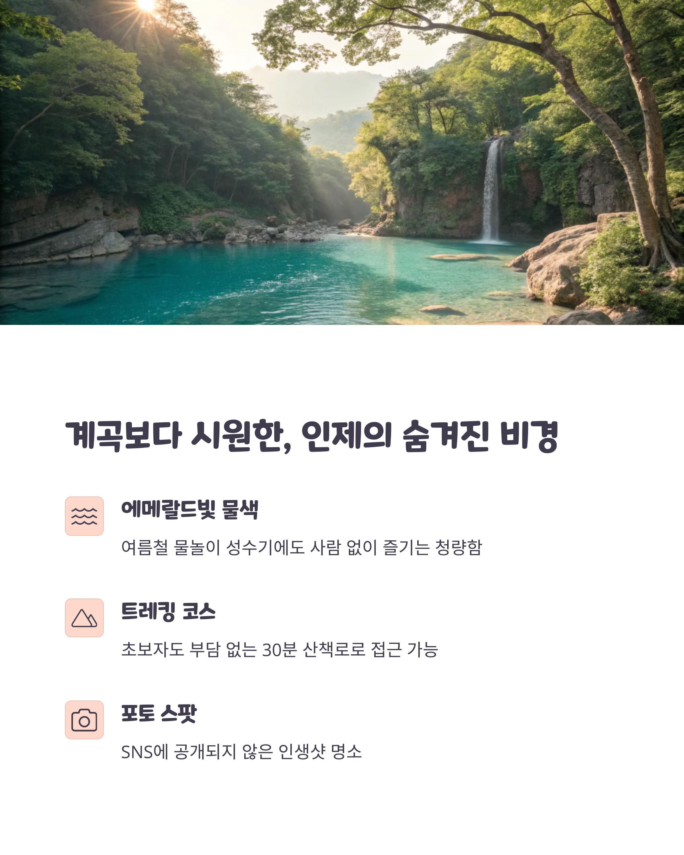 강원도 인제 하면 떠오르는 건 백담사? 그것만 알면 반쪽짜리 여행이에요. 제가 최근에 다녀온 인제 자작나무 숲 뒤편의 비밀 계곡, 그곳은 말 그대로 여름에도 서늘한 천국이었어요. 사람이 거의 없고 물은 유리처럼 맑고, 심지어 돌에 이끼 하나 없이 깨끗하더라구요. 그 날 새벽엔 약간 안개가 꼈었는데, 햇살이 비칠 때 그 물안개 너머 풍경이... 정말 숨멎 수준. 도심에서 2시간이면 닿을 수 있는 비밀스런 피서지로 추천합니다!