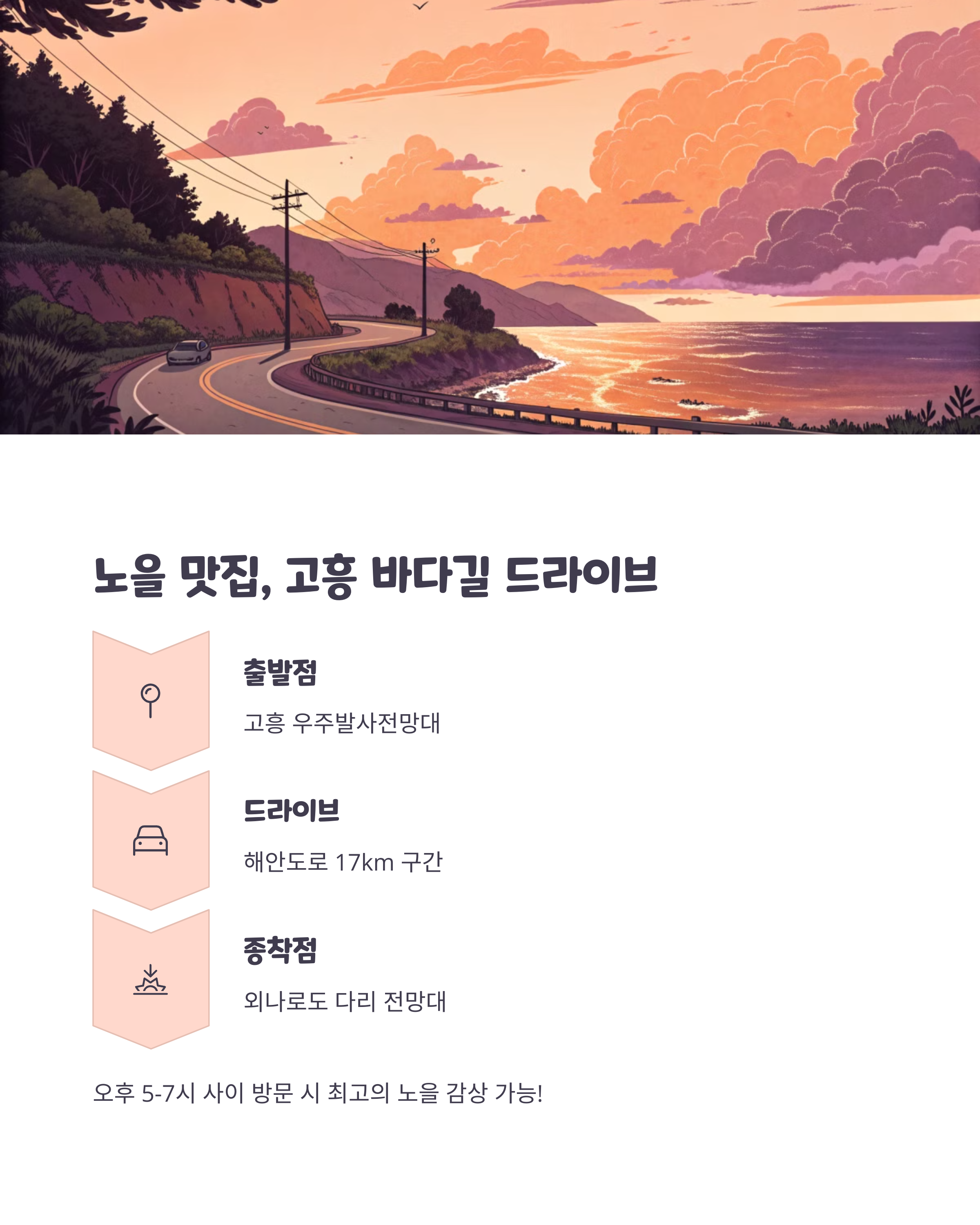 차창 밖 풍경이 영화 같았던 적 있으세요? 고흥의 해안도로는 진짜 드라이브의 정석 그 자체였어요. 특히 노을이 질 무렵엔 모든 게 핑크빛으로 물들어요. 시간 맞춰 간다면 마치 여행 광고 속 주인공이 된 기분!