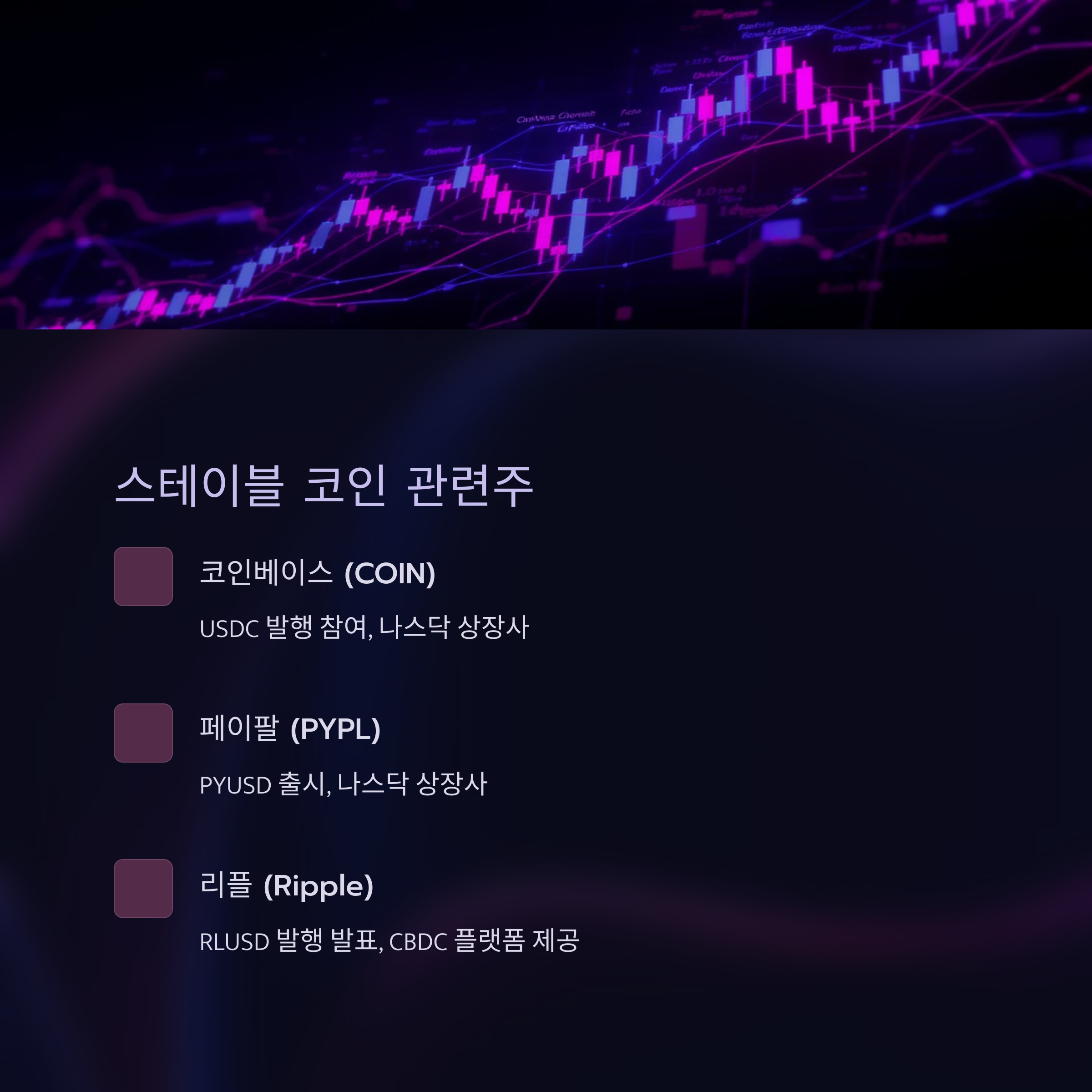 - 페이팔 (PayPal): 최근 자체 스테이블 코인인 PYUSD를 출시하며 스테이블 코인 시장에 본격적으로 뛰어들었습니다. 글로벌 결제 기업의 스테이블 코인 발행은 시장에 큰 영향을 미칠 수 있습니다. (나스닥 티커: PYPL)