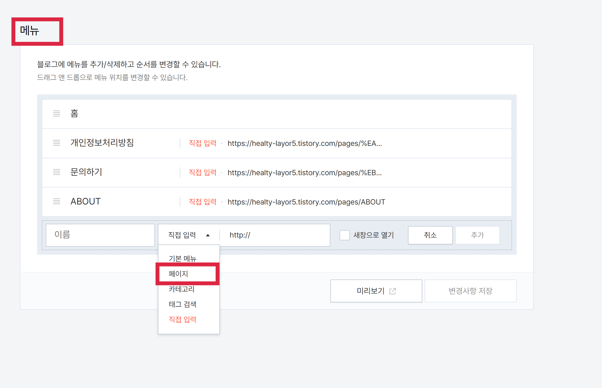 - 티스토리 관리자 ➔ 페이지 ➔ 새 페이지 만들기