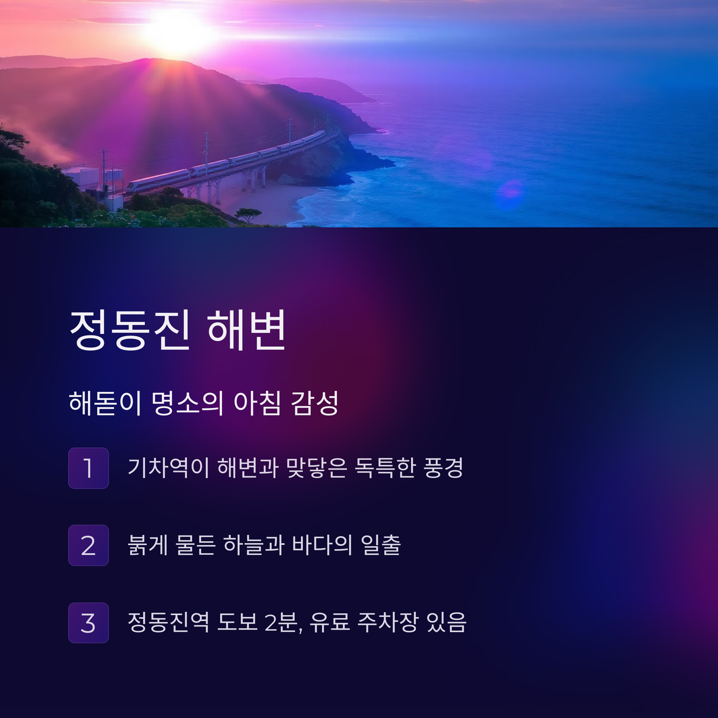 정동진은 해가 가장 먼저 뜨는 동해의 대표적인 포인트죠. 특히 기차역이 해변과 바로 맞닿아 있는 독특한 풍경은 SNS 인증샷 필수! 일출 시간에 맞춰 도착해 붉게 물든 하늘과 바다를 바라보면 모든 스트레스가 싹 날아가요.