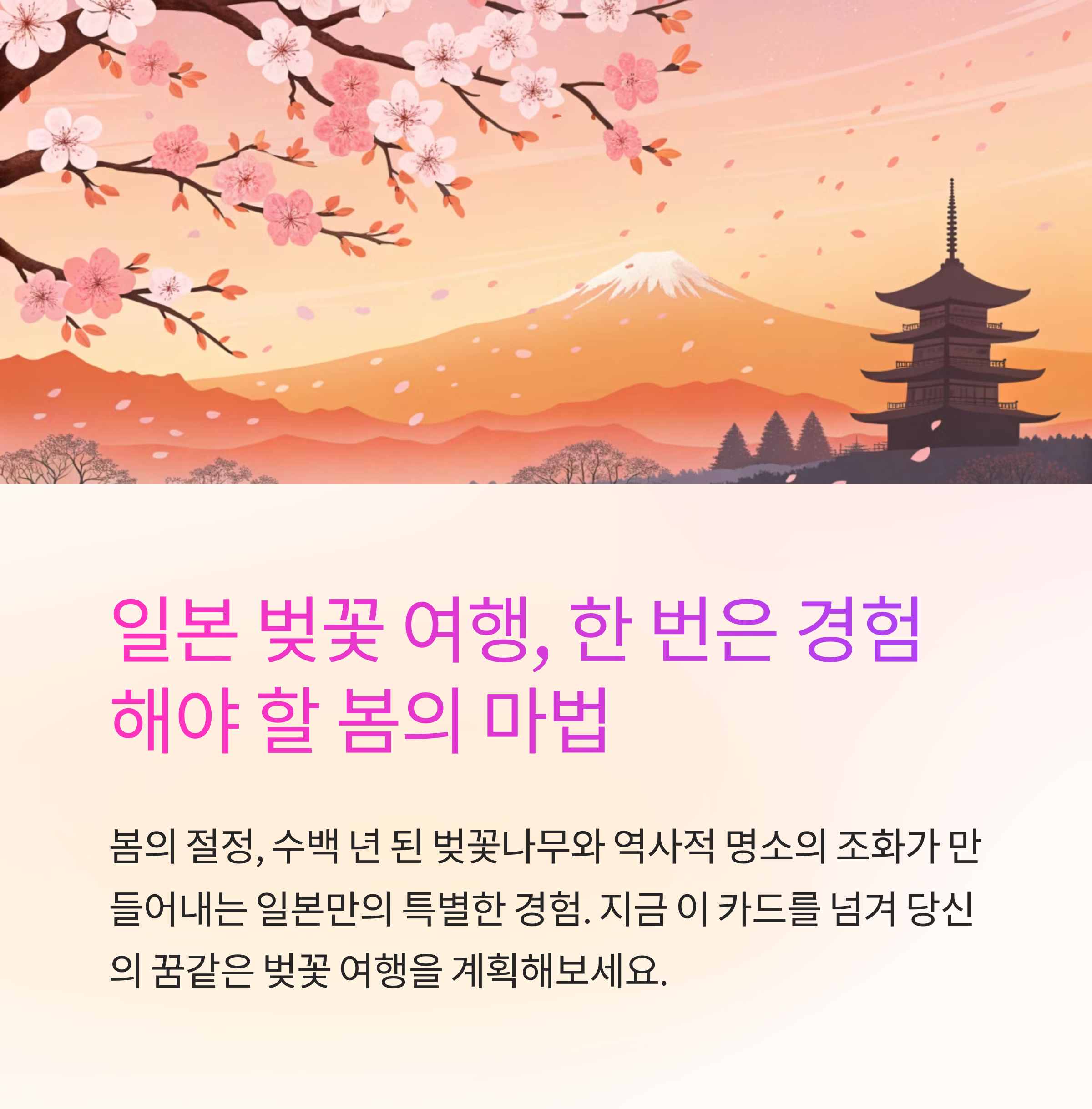 이번 봄엔 단순한 여행이 아닌, 오감으로 느끼는 감성 가득한 일본벚꽃여행에 도전해보세요. 자연과 문화, 감정이 어우러진 이 순간이 여러분의 기억 속에 가장 아름다운 계절로 남을 거예요.