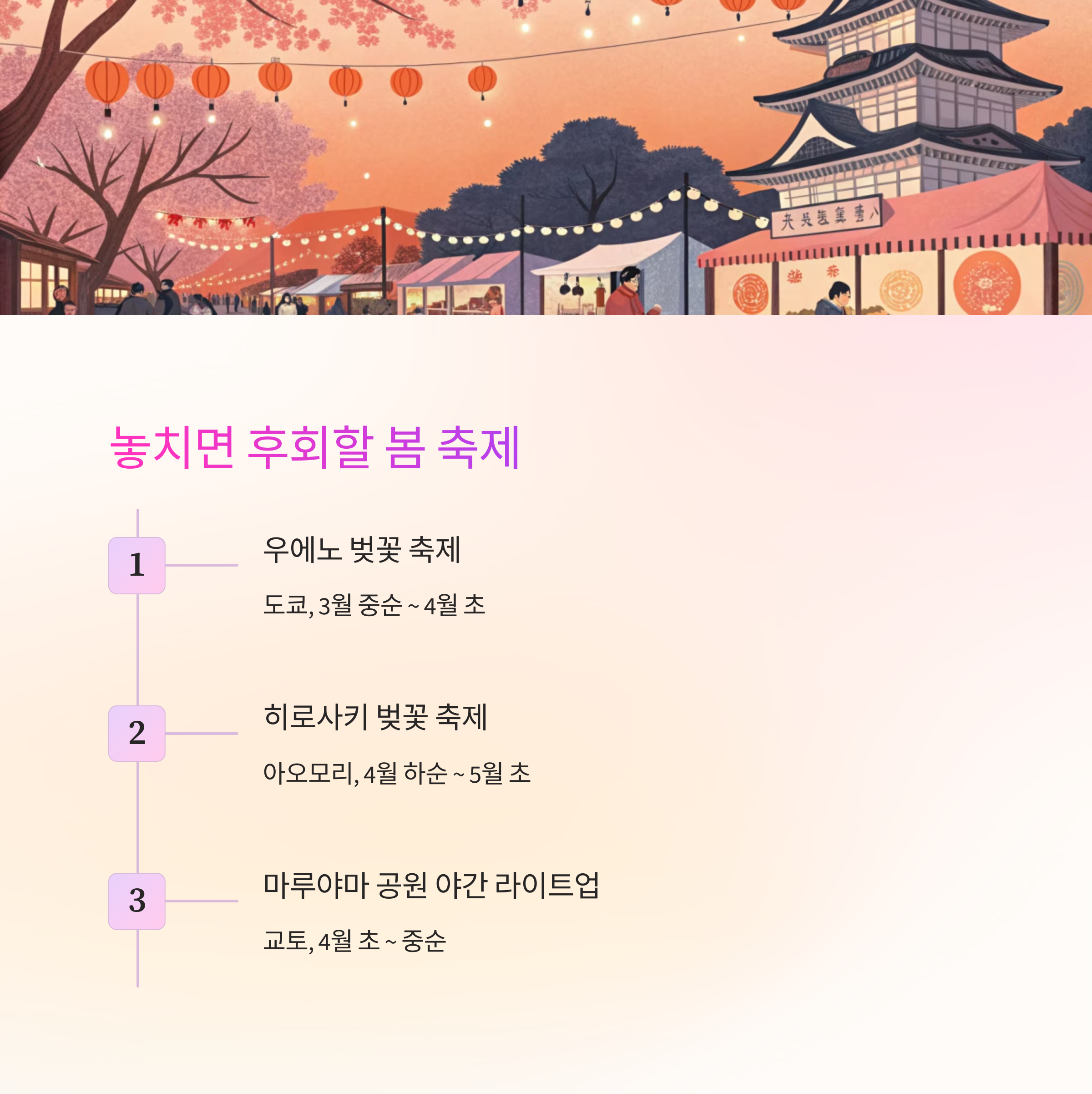 이처럼 벚꽃 시즌은 단순한 여행이 아닌, 오감으로 체험하는 봄 그 자체입니다. 이 시기 일본을 찾는 건 단순한 관광 그 이상이에요.