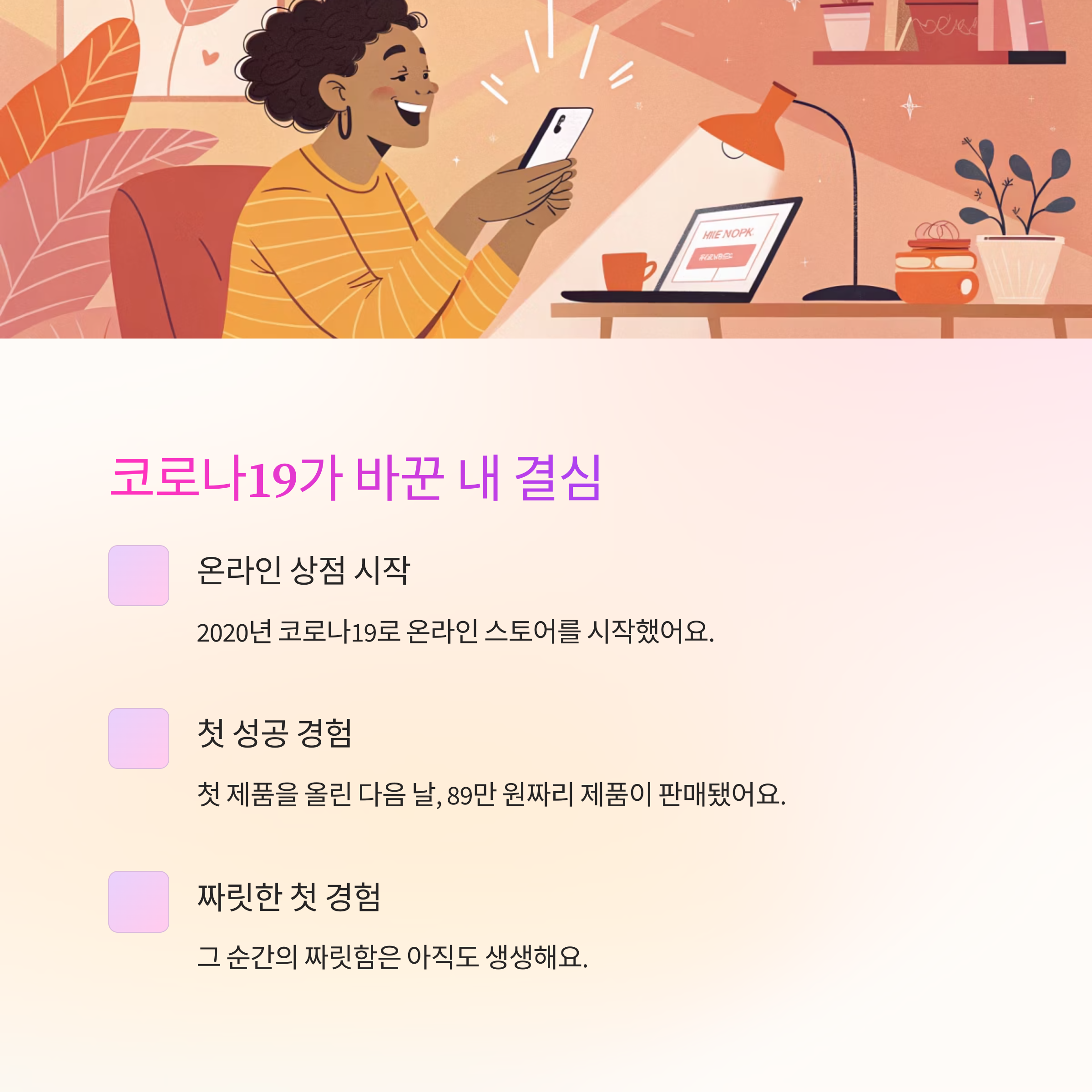 2020년, 코로나19가 모든 일상을 바꿨을 때, 나는 결심했어요. “이젠 온라인에 나만의 상점을 만들어야겠다.” 유튜브로 스마트스토어를 독학했고, 첫 제품을 올린 다음 날, 89만 원짜리 제품이 판매됐어요. 그 순간의 짜릿함은 아직도 생생해요.