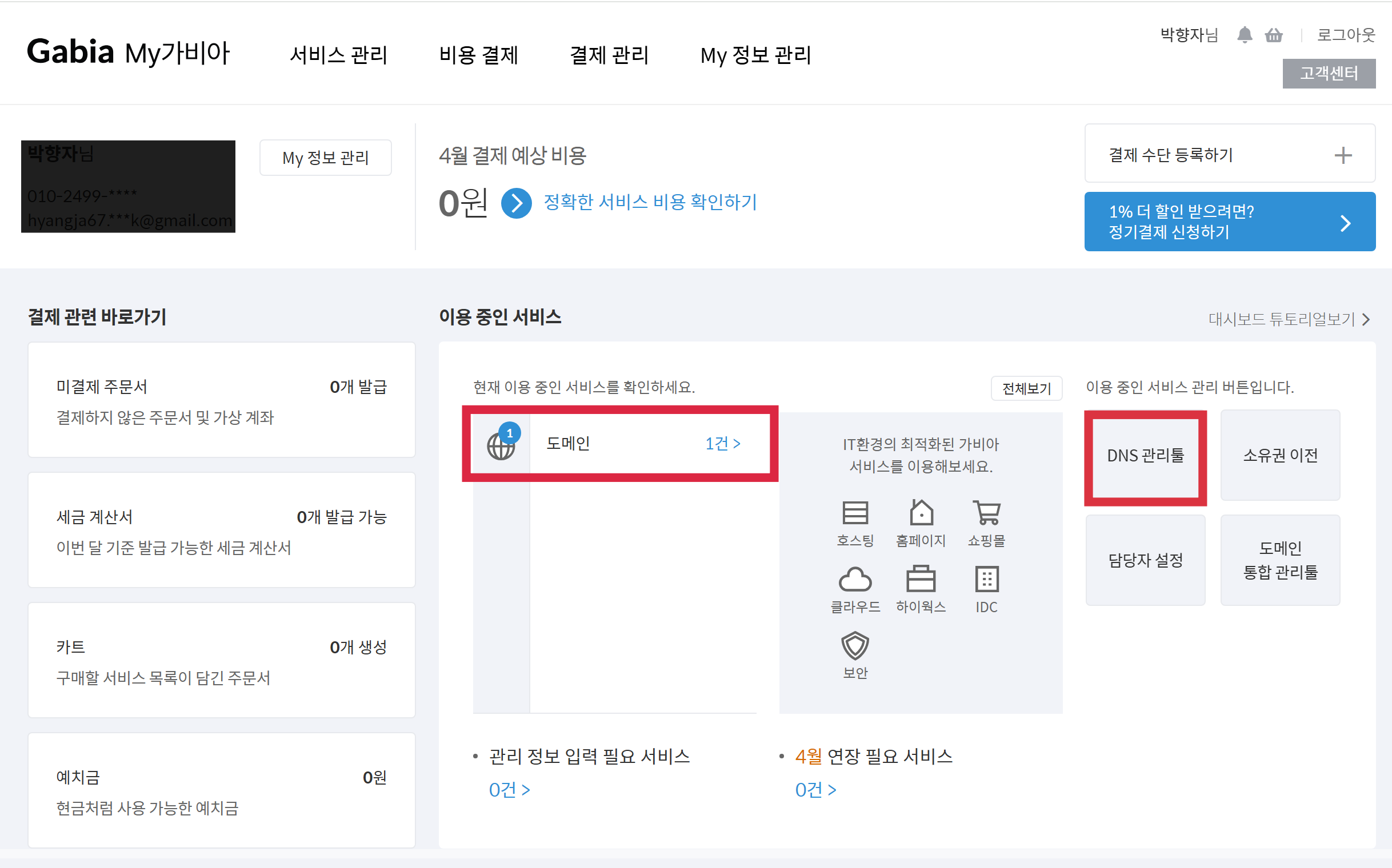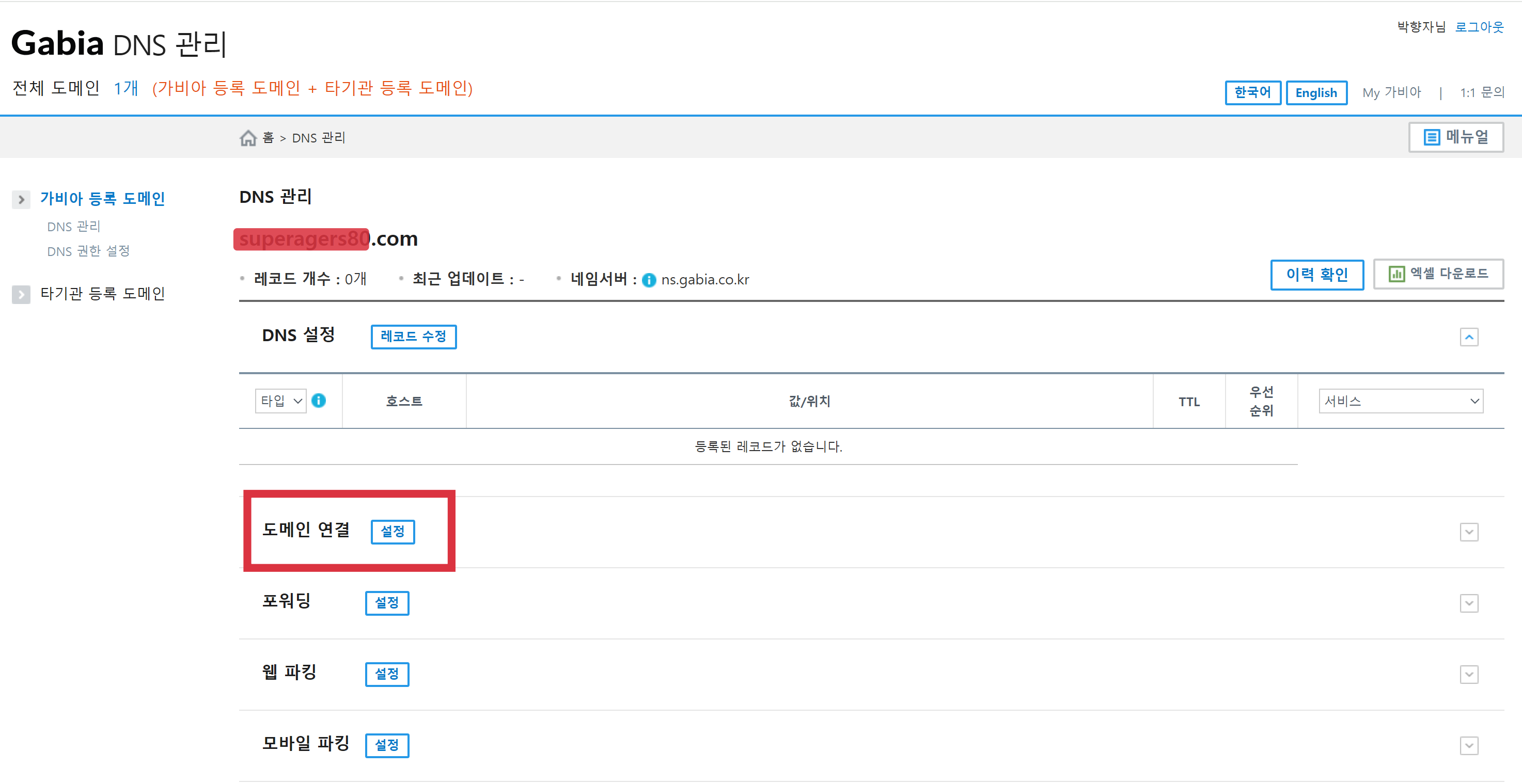 가비아 로그인 후 마이가비아-> 도메인 클릭