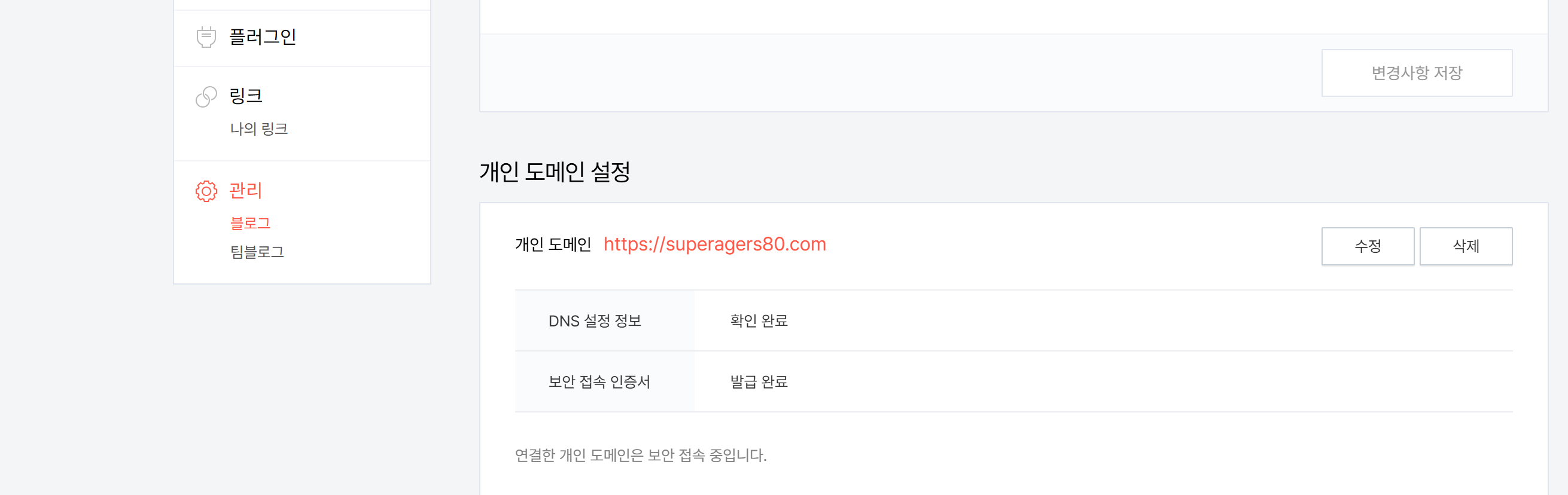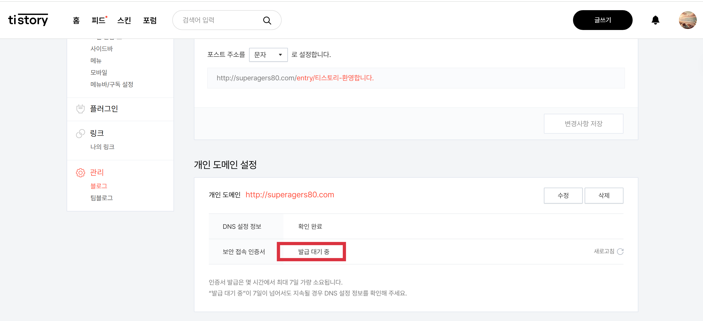 티스토리 블로그 관리자 ‘개인 도메인 설정’ 화면 예시