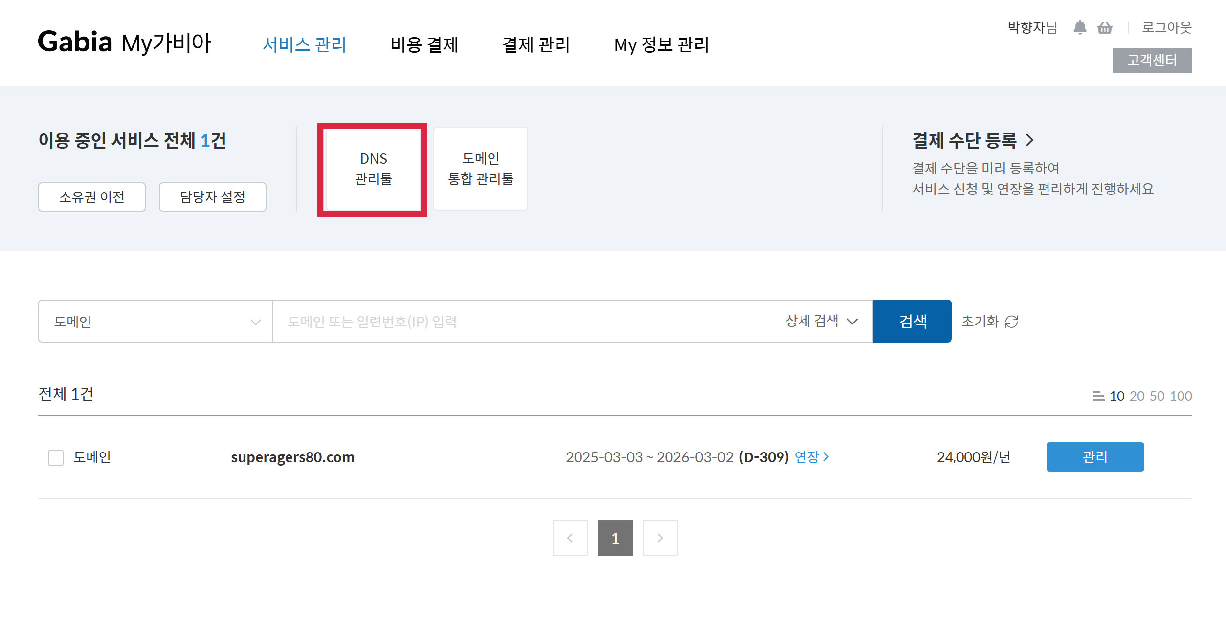 📌 ALT 텍스트: 가비아 로그인 후 ‘도메인 관리’ 화면 예시